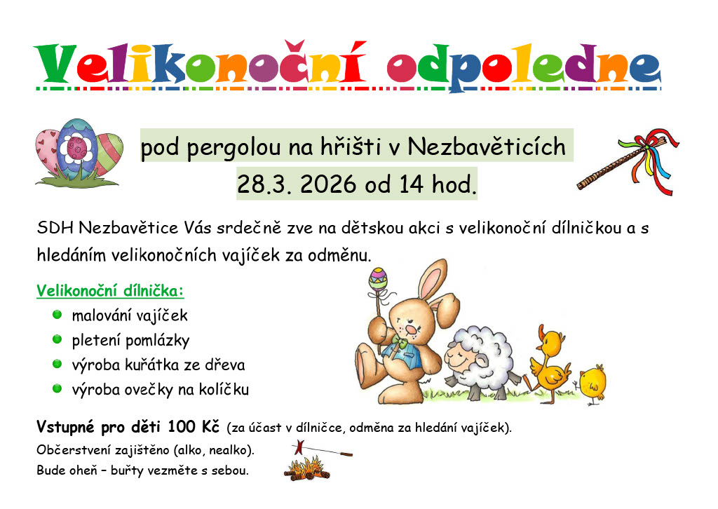 SDH Nezbavětice Vás srdečně zve na dětskou akci s velikonoční dílničkou a s hledáním velikonočních vajíček za odměnu. Vstupné 100 Kč, občerstvení zjištěno